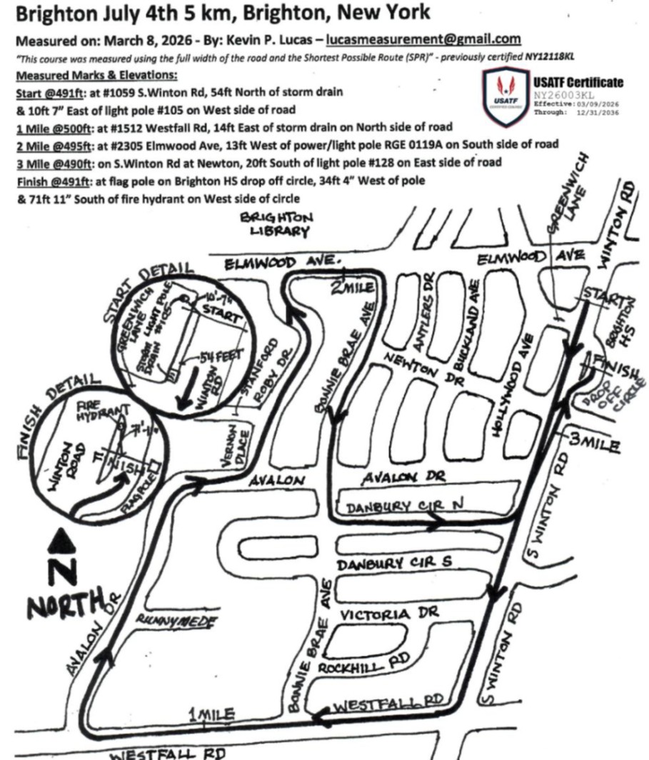Finish/Start Line: Brighton High School School Winton Avenue side. Starts on Winton and finishes in Bus Loop in front of High School
